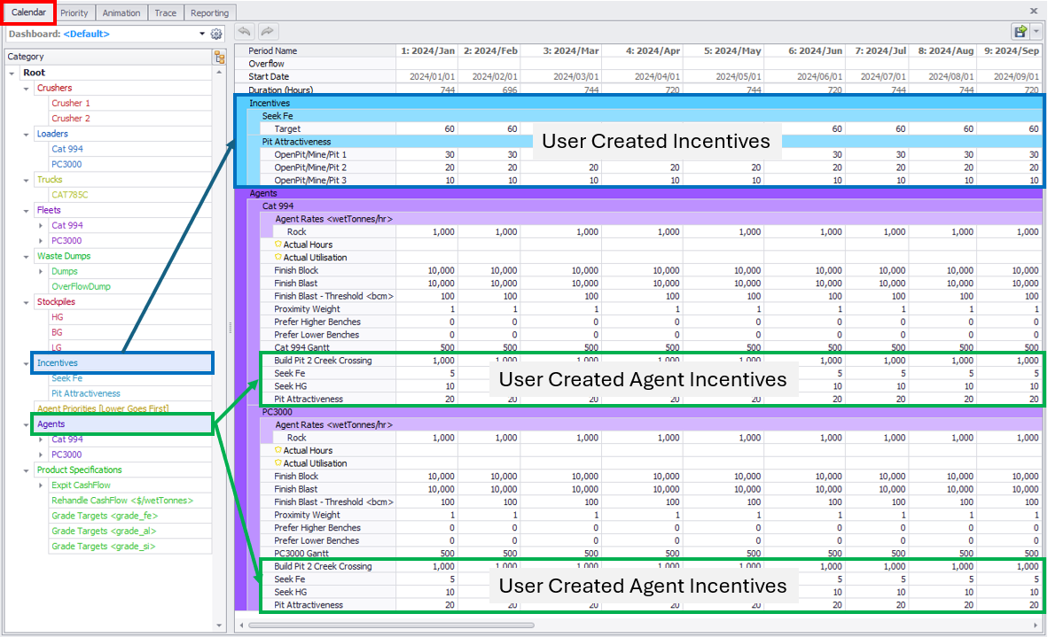 Incentives rows in the Calendar and Calendar weightings of Incentives by Agent