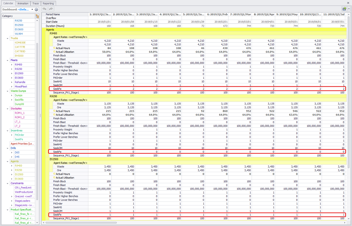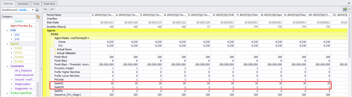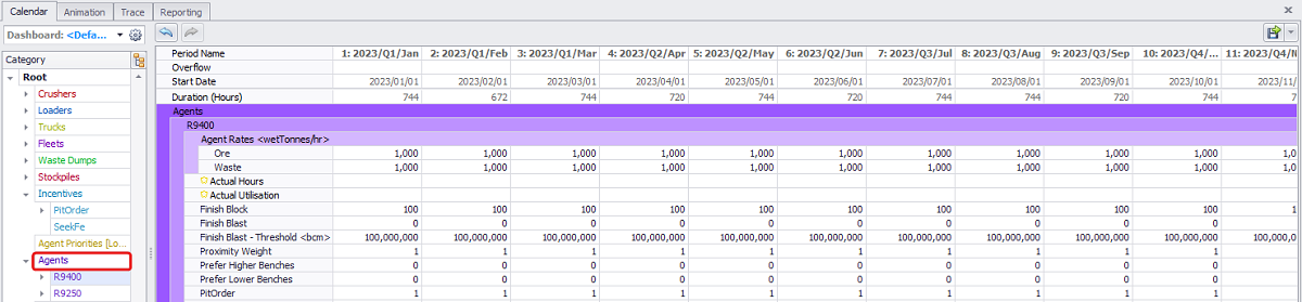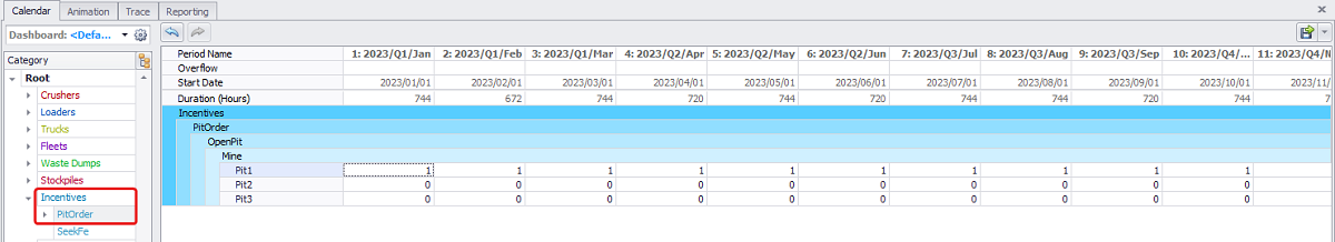 Specify an Attractiveness at the Pit level (for example, to prioritise Pit1 over Pit2). It will generate a row in the Calendar, to which we can assign a weighting that will be used to ranks the available blocks.