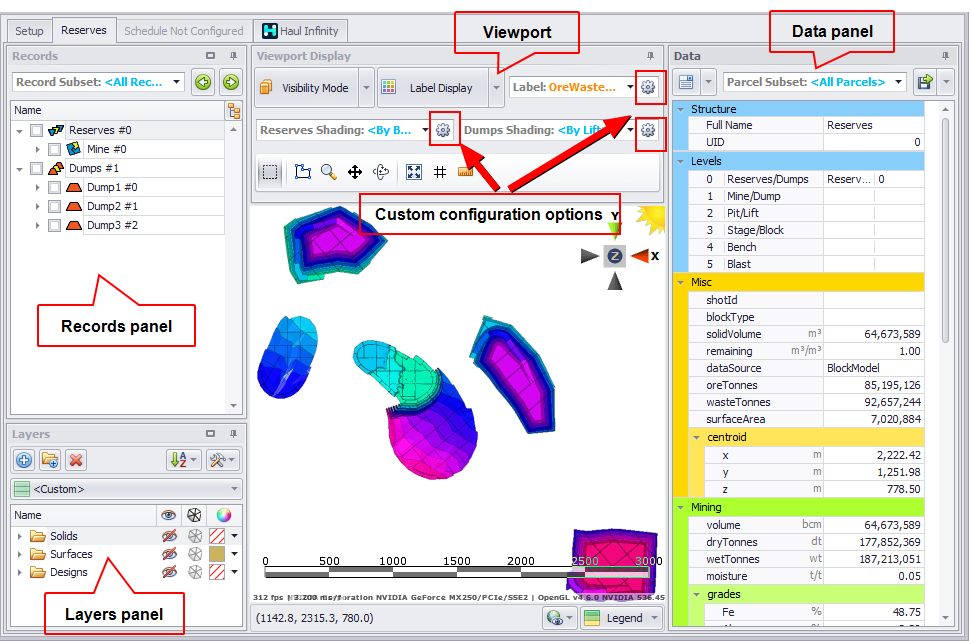 The Reserves tab is the area to view and analyse reserve and dump solids and their contents. It is the primary 3D working environment for the project and allows you to: