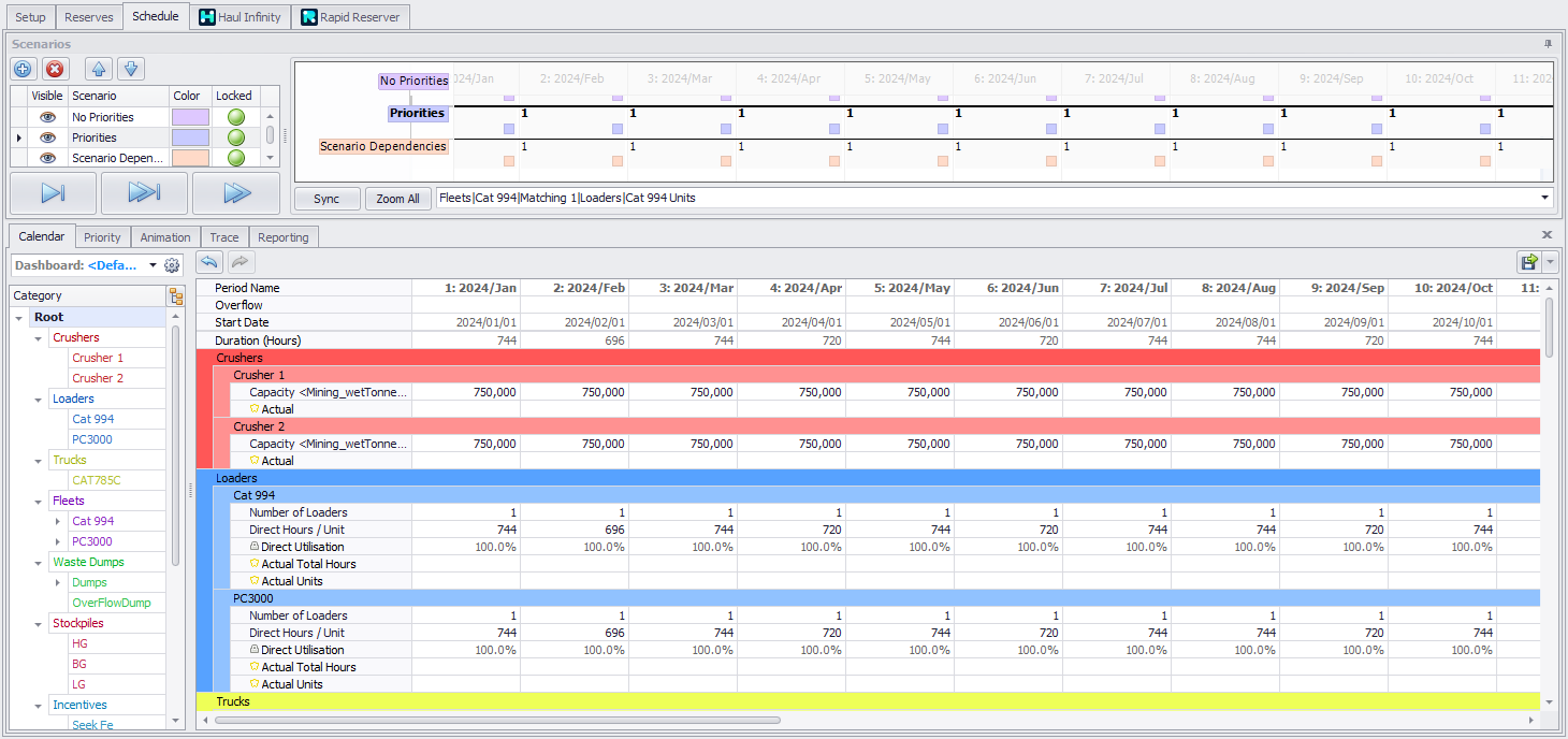 The Schedule tab comprises several important work areas: a Scenarios Panel as well as several auxiliary tabs, each of which has its own functionality. For more information, click on the following links or use the table-of-contents (left) to navigate between the sub-topics.