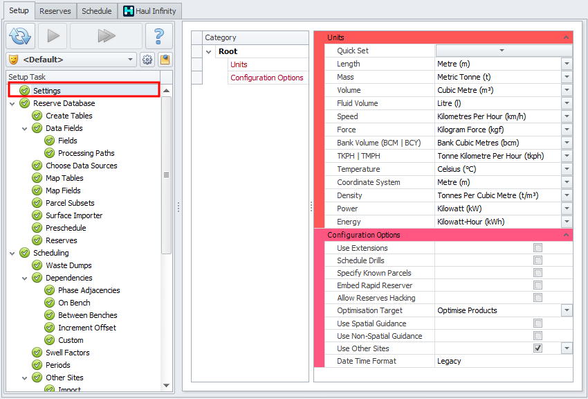 Tactical Scheduler settings can be viewed and edited in the Setup Task > Settings setup step.