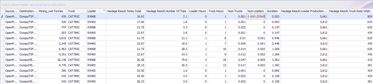Use this table to spot check the truck and loader time usage per haul.