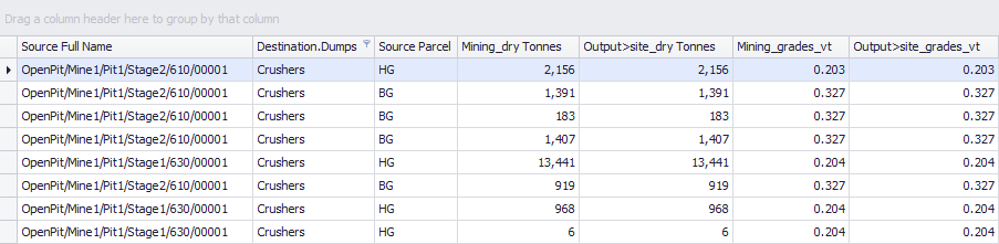 Use this table to confirm that subproduct ratios, process recovery, call factors and moisture changes are being correctly applied to crusher feed from both reserves and stockpiles.