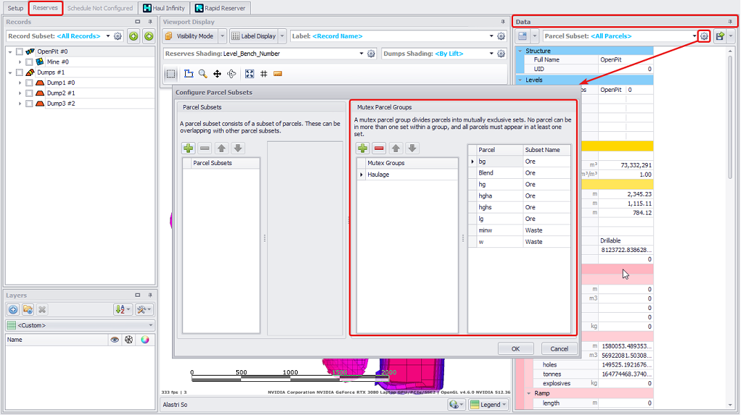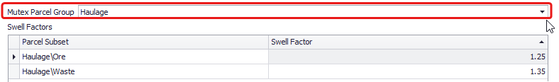 If you need to apply swell factors not to all individual parcels, but to a certain selection, you may choose one of the Mutex Parcel Groups preconfigured in the Parcel Subsets step. For example, if have a common swell factor between Ore and Waste parcels, you may create and select a mutex group, to input 2 values rather than multiple.