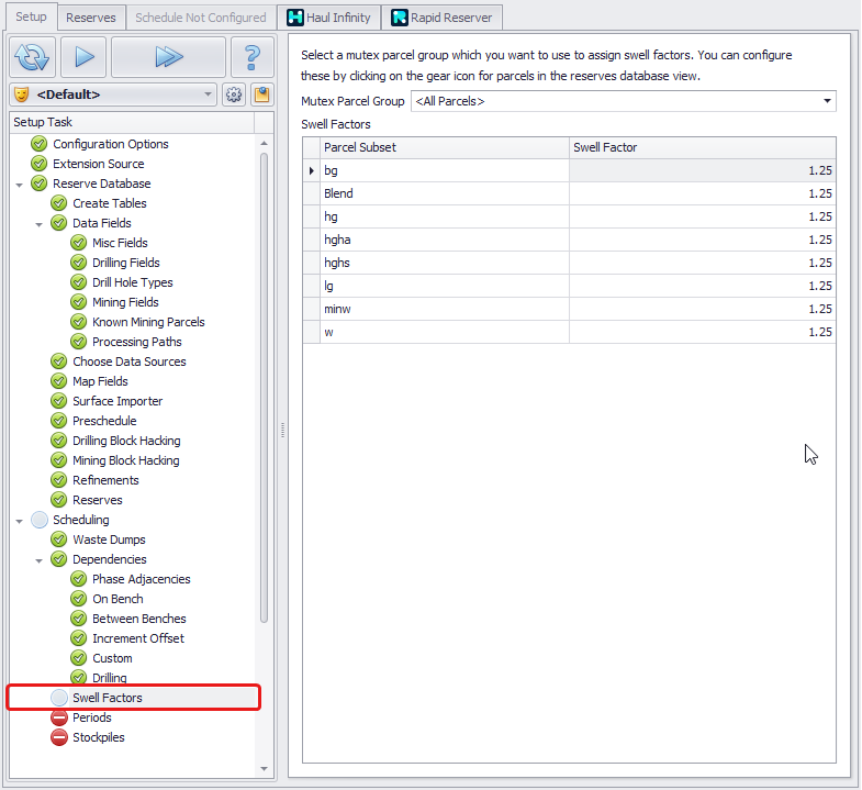 Swell factors for haulage calculations can be configured in Haul Infinity under the Materials setup task.
