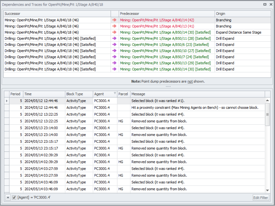 appears in the Trace messages when the Agent Rate is below <1000 wt/h> because the software evaluates a Block that has <10,000 wet tonnes> in a Period which is <10 hours> long.