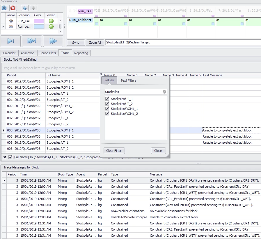 Note that stockpiles only appear in the Trace Report when scheduling in Truck Constrained mode.