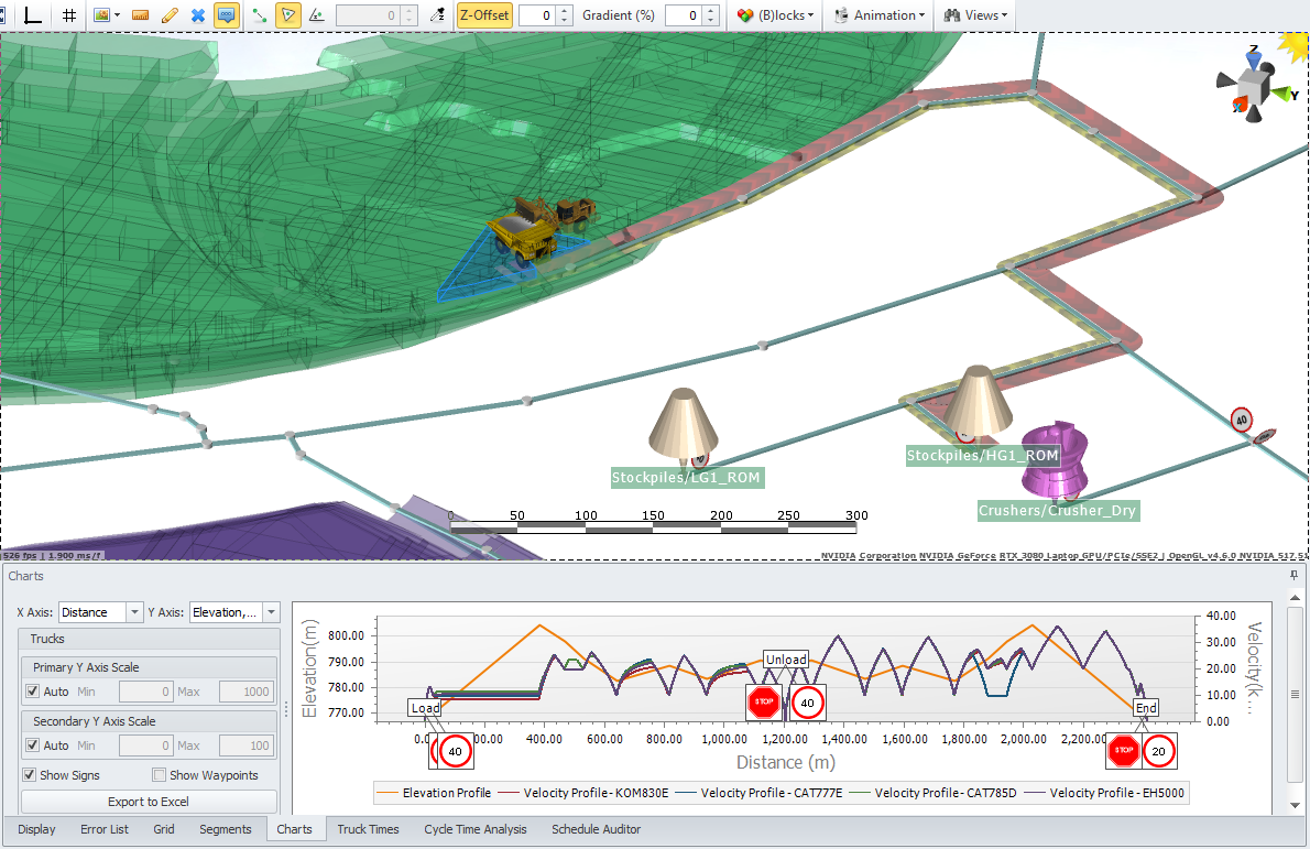 Reporting functions include Travel Times, Cycle Times, Elevation Profiles, Velocity Profiles, Engine Load and Fuel Load.