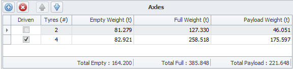 Axle data is used to calculate road friction forces and TKPH on tires during travel. It shows the full and empty weight over each axle, the number of tyres on that axle, and whether it is driven.