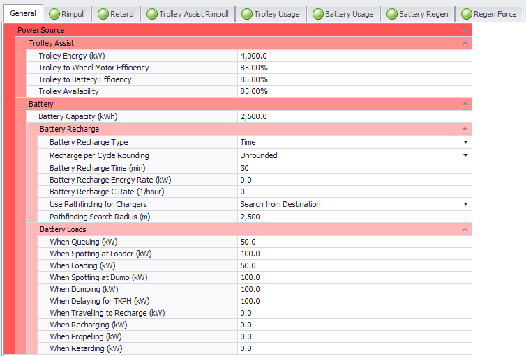Haul Infinity uses this to calculate total battery energy used on each haul cycle if the trucks power source is Battery (Models > Type > Electric).