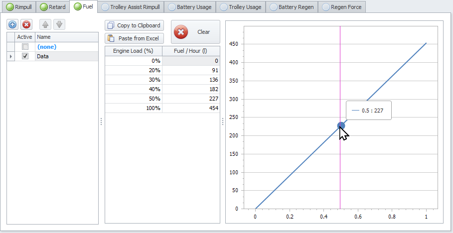 If fuel burn data is not present in the imported truck file, but applicable for your project, you need to source it from the manufacturer and provide to alastrisupport@micromine.com to digitise it for you. Otherwise, you can populate Engine Load % and Fuel/ Hour consumption in Excel and paste it using the Paste from Excel button, or use the Truck Creator tool.