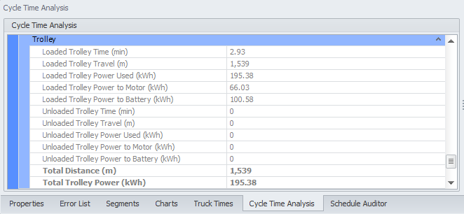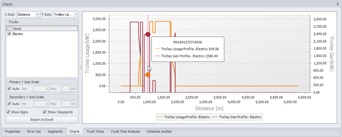 Electric trucks are often capable of delivering significantly more power at the wheels while attached to a trolley, which results in a higher power draw. The amount of power used is captured via the Trolley Usage curve, ensuring accurate reporting for capacity planning.