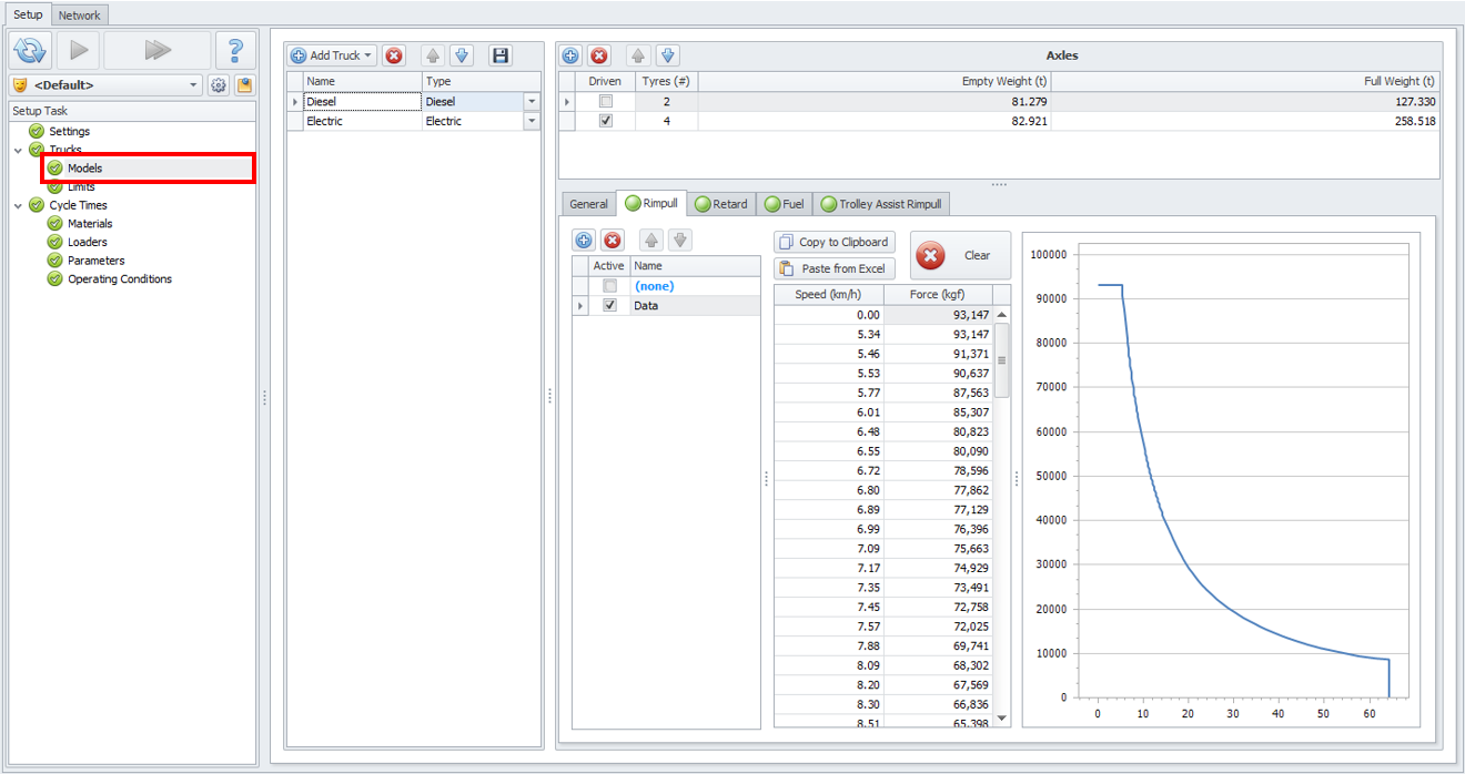 In the Models step enter truck data to calculate acceleration, deceleration, axle loading, fuel burn, as well as battery trucks and trolley assist recharging parameters.