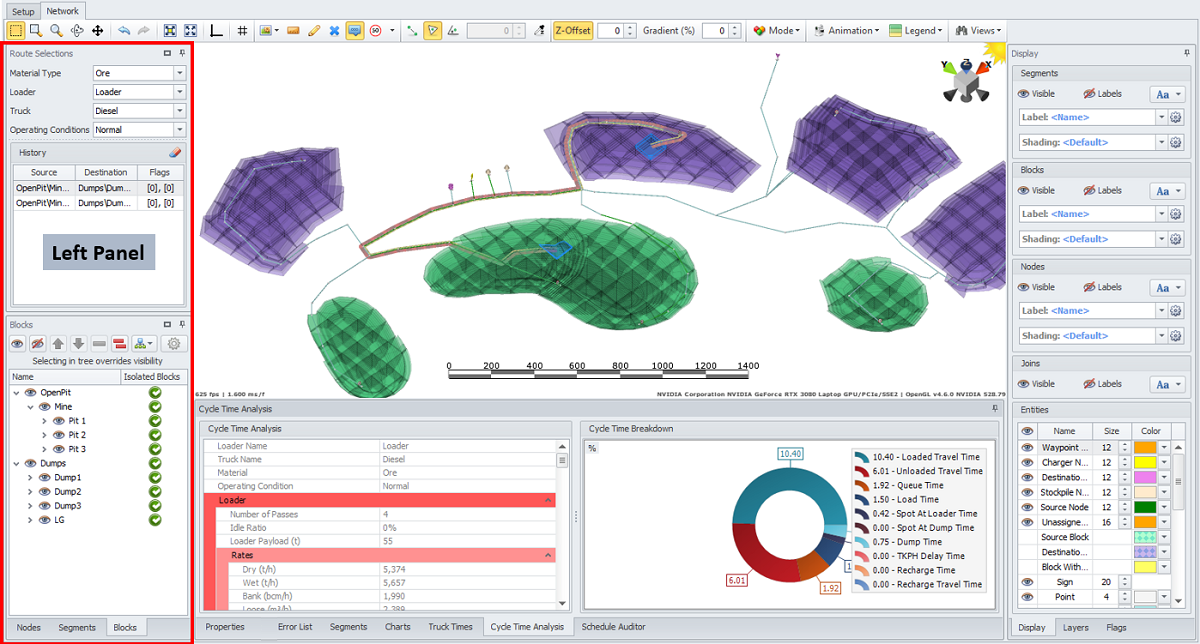 On the left-hand side of the Network tab there is a panel which comprises upper and lower panes: Route Selections and a History pane at the top; Nodes, Segments and Blocks panes at the bottom.