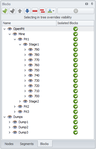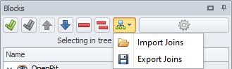 Open the Blocks tab to select, show/hide, move up and down in the list, delete blocks, as well as to import and export joins and set travel level and travel alignment.