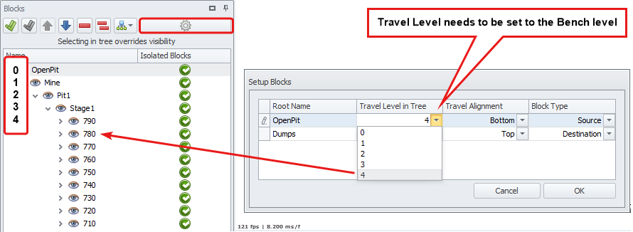Click thegear icon to open the Setup Blocks menu, where you can select Travel Level in Tree (in relation to the path RL), Travel Alignment (bottom, middle or top) and Block Type (Source or Destination).