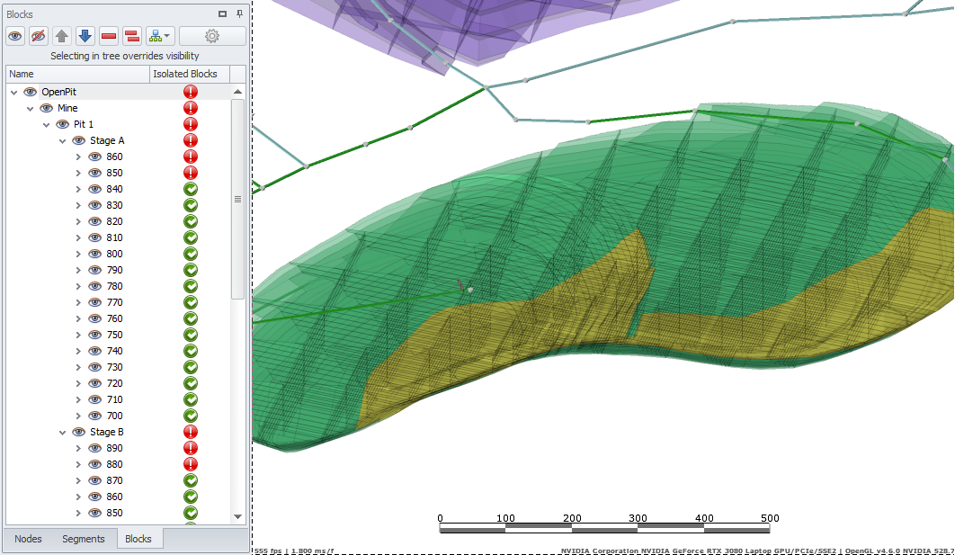 Open the Nodes tab (bottom left corner) to select and group the nodes displayed in the viewport by their attributes.