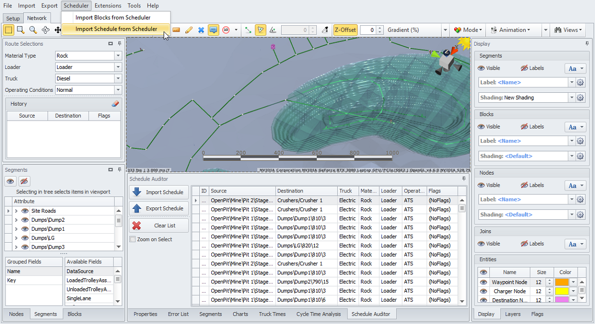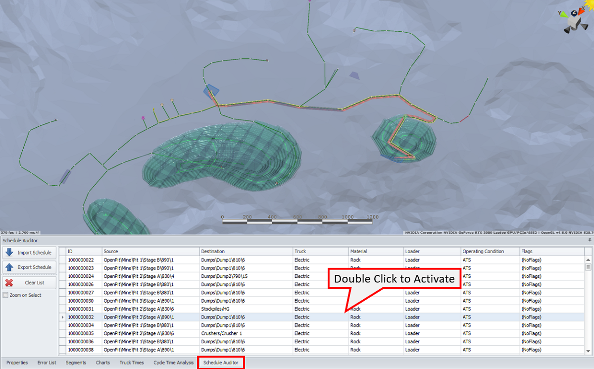Double click the first line in the schedule auditor to activate the haul in the viewport. We can use the arrow keys to move forward and backward through the schedule; this lets us inspect the haulage solutions provided by Haul Infinity and make any functional changes to the network as required.
