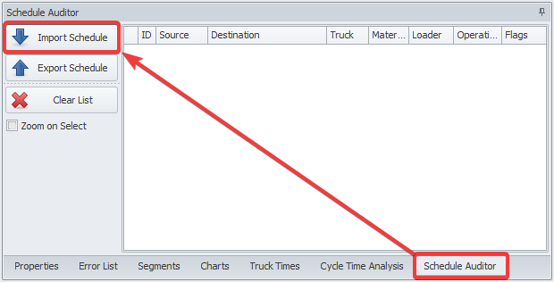Make sure that each row in the schedule contains a source, destination, truck type, material and loader.