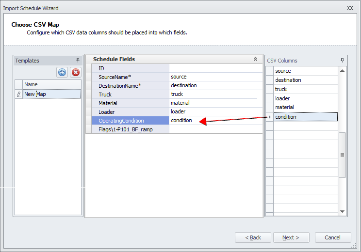 Drag and drop the CSV column headers to the corresponding schedule field. The ID and Flag fields can be left blank: