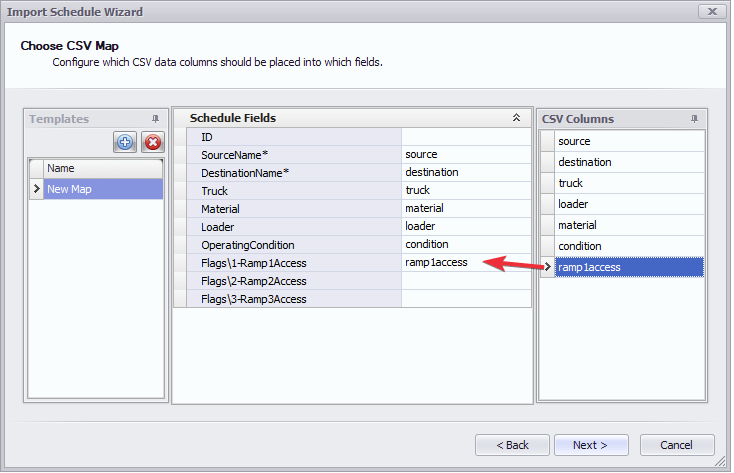 Map the fields to the column headers, including the "Ramp1Access" flag state: