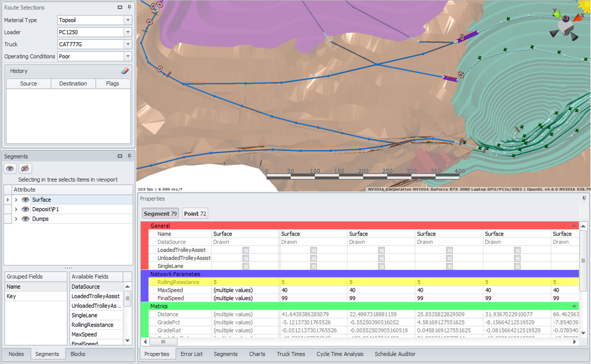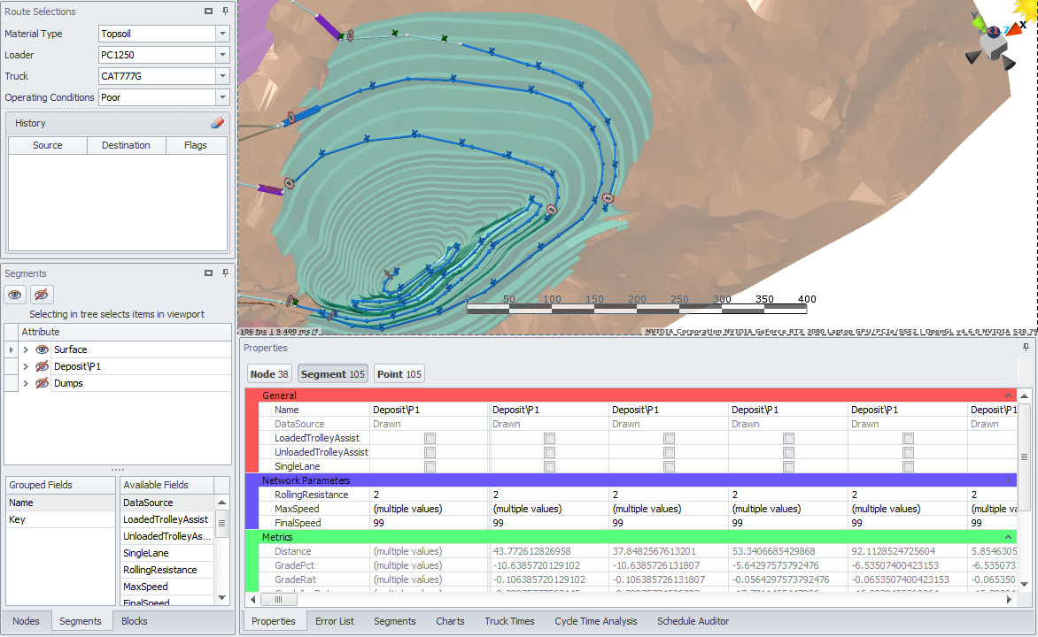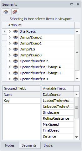 Grouping segments by name or data source can make it much easier to edit and interact with the network later on, especially if you have many interim pit ramps criss-crossing at different elevations.