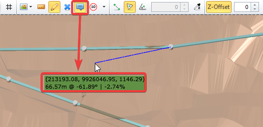 Hover the mouse over the next bench level to see the distance, bearing and gradient. Find a 10% gradient and continue the ramp.