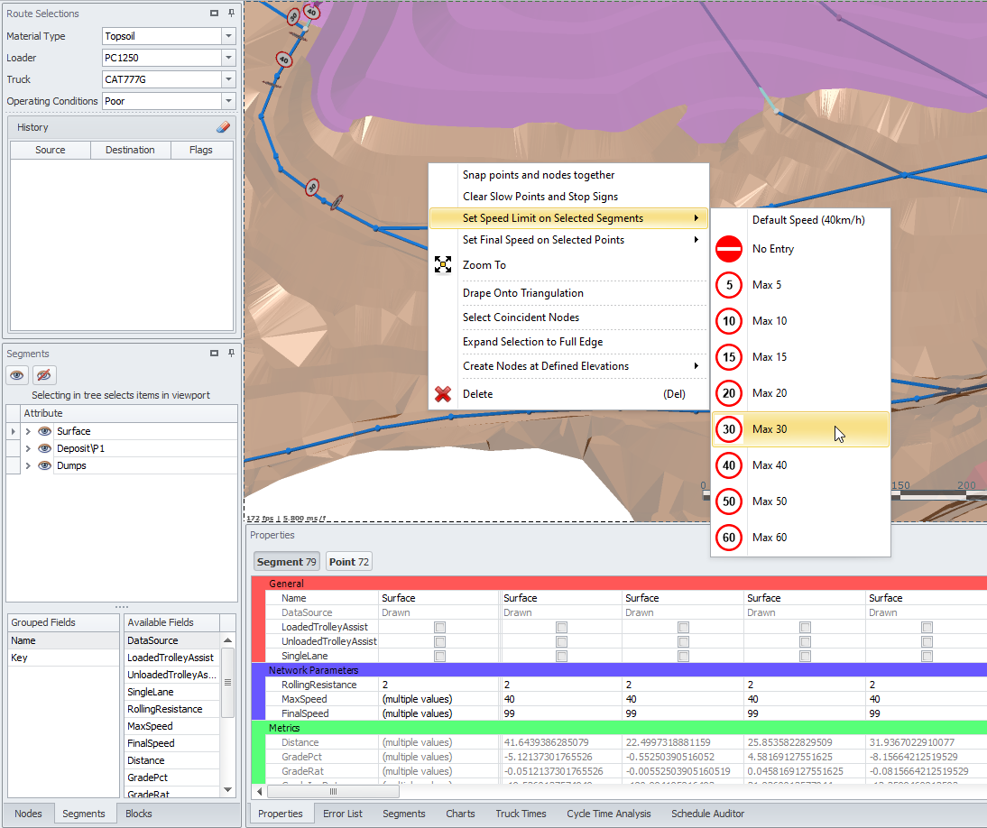 Right Click in the Viewport and choose "Set Speed Limit on Selected Segments" to set speeds in the pit/on the dump.