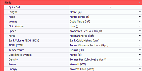Select the units of measurement which match your site coordinate system and local standards. Use the Quick Set drop-down to select Metric or Imperial units of measurement. |
