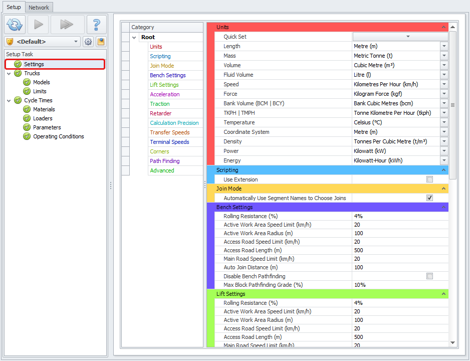 In the Settings section you may set units of measurements, options and thresholds to use in the project.