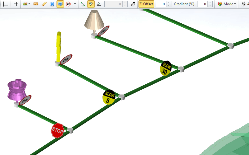 Road signs can be placed onto the network to reproduce the site road rules.