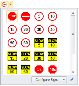 To add, expand the Configure Signs dropdown menu and select the signs you want to see in the panel above and be able to apply to the road sections.
