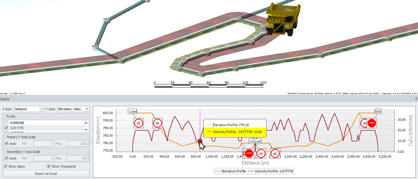 Go to the Charts tab and hover the cursor over the curve to see the velocity profile of the selected truck(s).
