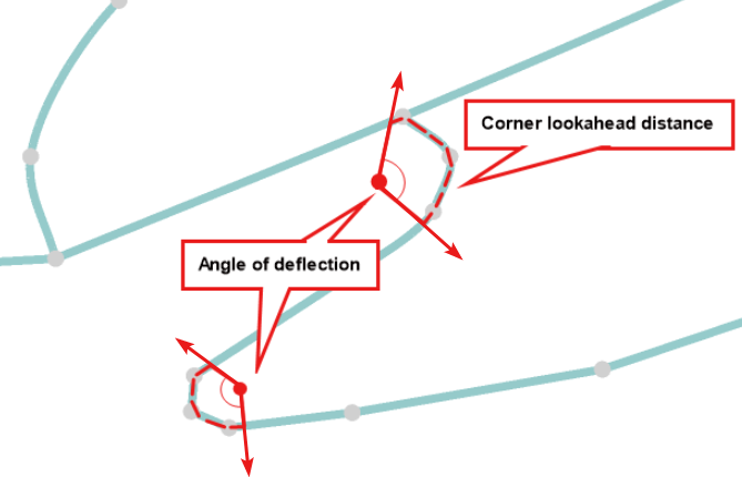 The angle of deflection is calculated from the total distance travelled during cornering (the "corner lookahead distance").