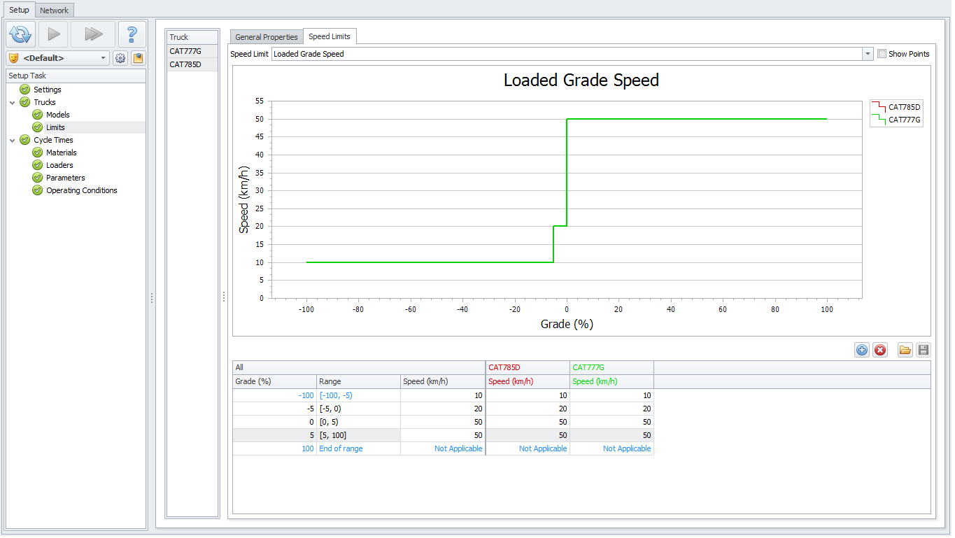 Haul Infinity automatically assigns speed limits to loaded/unloaded trucks based on the inputs in the Limits step > Speed Limits table.