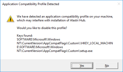 “We have detected an application compatibility profile on your machine, which may interfere with installation of Alastri Hub”.