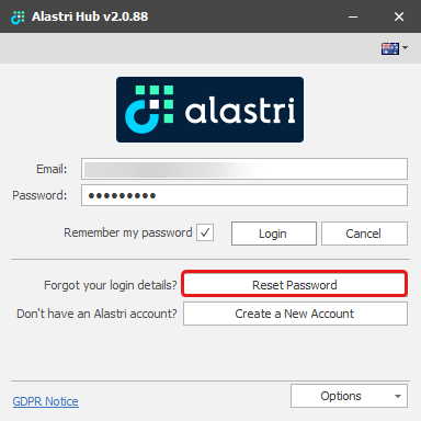 Should the user forget their password, the Hub login form features the option for the user to Reset the password (Reset Password button). This will take them to the Alastri website where the user can enter their email address. An email will be sent to the entered email address with a password reset link.