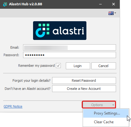 If you are connecting through a company proxy, press Proxy settings in the bottom right corner of the login form.