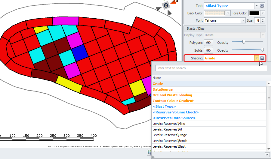 In the Blasts/Digs panel on the right, from the Shading drop-down select the blasts shading you have created - Grade (Note that custom shadings are shown in bold orange, while standard shadings are shown in normal black).