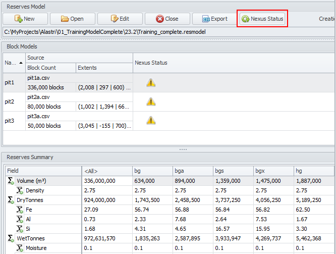 Currently, when reopening an Alastri project, the block model status is unknown. Click the Nexus Status button to check the latest model sync status.