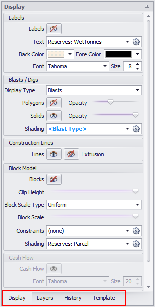 On the right-hand side of the Designer tab, the Display Panel comprises four tabs as described below.