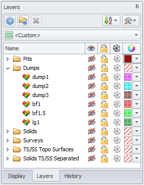 The Layers tab is a common part of all Alastri products. In this panel you may import surfaces and solids triangulations, display and organize them, as well as assign colors, visibility and other properties. For more detailed information on the Layers panel tools, see: Layers/Overlays Panel