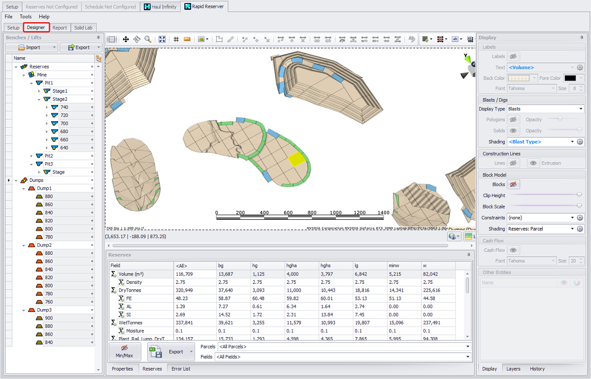 The Designer tab is the primary 3D work environment for your project and is the main area to view, create, modify, manipulate and analyze reserves and dumps solids, shapes, polygons and lines.