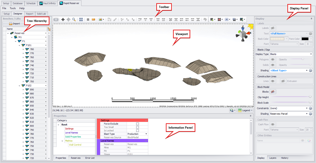 The Designer tab user interface comprises four areas. Each of these comprise several elements, tabs and fields: