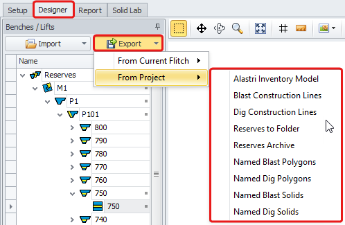 In the Designer tab > Benches/Lifts panel, press the Export button provided for exporting Alastri Inventory Model (see Alastri Inventory Model) Construction Lines, Reserves, Named Blast and Dig Polygons and Solids for further mine planning and operational activities.