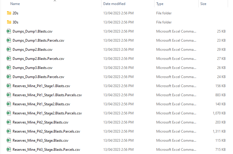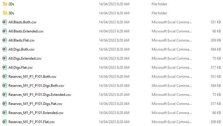 Extended - includes data on Names, Coordinates, Bench Heights, Volume, Area, Perimeter, Wall Controls, Blast Type, Custom Labels, Blast Properties and references to 3D and 2D files/