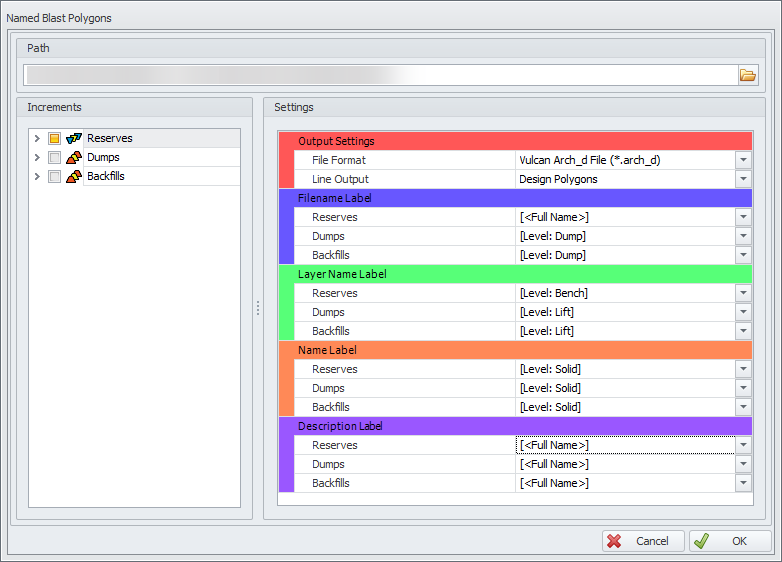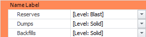 Use the drop-downs to select a name label for: Reserves, Dumps and Backfills. A label has to be selected for each table, even if its increments are not included in the export. Otherwise, you’ll get an error message prompting to map labels for each level. |