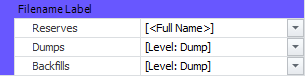 Use the drop-downs to select a filename label* for: Reserves, Dumps and Backfills. A label has to be selected for each table, even if its increments are not included in the export. Otherwise, you’ll get an error message prompting to map labels for each level. See the Notes below. |