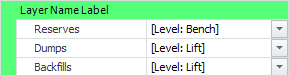 Use the drop-downs to select a layer name label for: Reserves, Dumps and Backfills. A label has to be selected for each table, even if its increments are not included in the export. Otherwise, you’ll get an error message prompting to map labels for each level. |