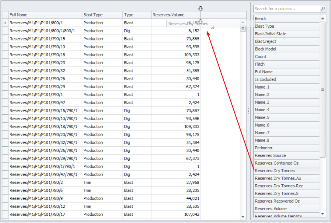 In the Grid type reports you may drag and drop fields from the right hand list directly to the report display area. You may change the columns display order by dragging column headers as well as remove them from display by dragging them out to any empty area.